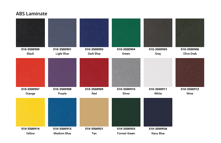 Laminate panels are available in a wide array of colours and usually consist of an ABS, fiberglass or aluminum sheet bonded to a plywood panel. The majority of our laminated cases are constructed with, but not limited to the materials listed below: